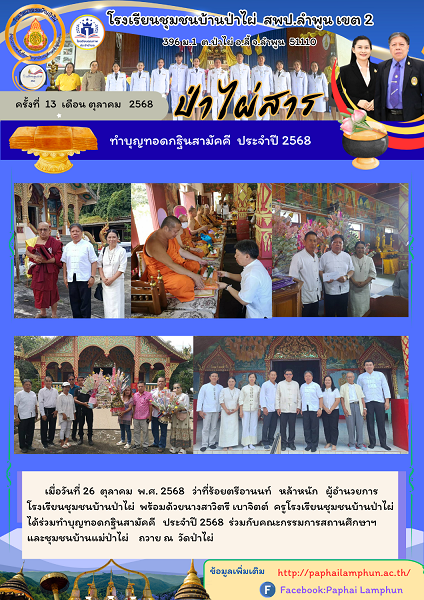 เมื่อวันที่ 26 ตุลาคม พ.ศ. 2568 ว่าที่ร้อยตรีอานนท์ หล้าหนัก ผู้อำนวยการโรงเรียนชุมชนบ้านป่าไผ่ พร้อมด้วยนางสาวิตรี เบาจิตต์ ครูโรงเรียนชุมชนบ้านป่าไผ่ ได้ร่วมทำบุญทอดกฐินสามัคคี ประจำปี 2568 ร่วมกับคณะกรรมการสถานศึกษาฯ และชุมชนบ้านแม่ป่าไผ่ ถวาย ณ วัดป่าไผ่ |