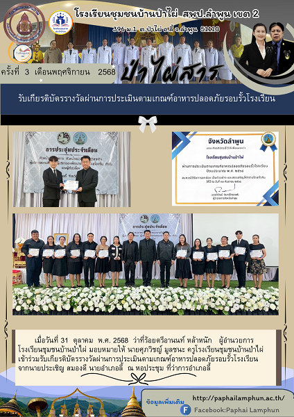 รับเกียรติบัตรรางวัลผ่านการประเมินตามเกณฑ์อาหารปลอดภัยรอบรั้วโรงเรียน